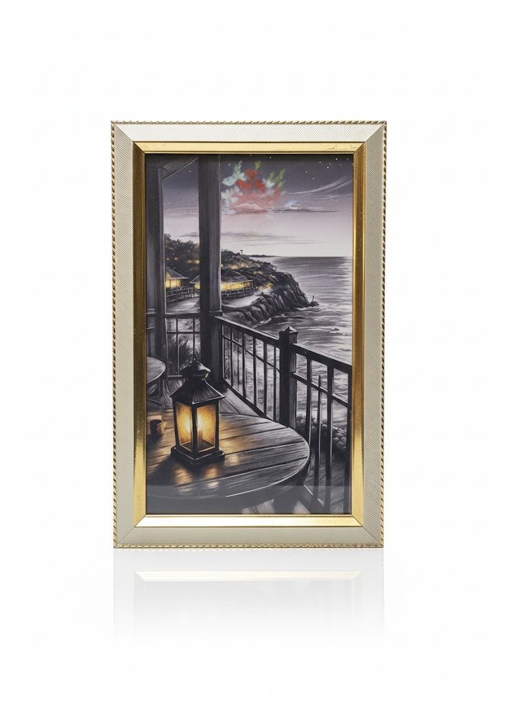 Escape to a moment of quiet solitude with the Peaceful Coastal Night Scene Framed Art Print. This deeply atmospheric artwork invites you onto a seaside balcony, where a warm, glowing lantern rests on a wooden table, illuminating the immediate space. Beyond the railing, the dark, turbulent ocean meets a rugged coast, with distant lights from a village providing a cozy contrast to the vast night sky.