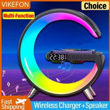 “Transform your bedside or workspace with the G-Shape Multifunction Wireless Charger and Smart Lamp, now available at Virtual Bazaar. This innovative all-in-one device combines a powerful 15W fast wireless charging pad with a high-quality Bluetooth speaker and a stunning RGB atmosphere lamp. Its unique G-shaped design serves as a modern art piece while clearing up cable clutter from your desk or nightstand.