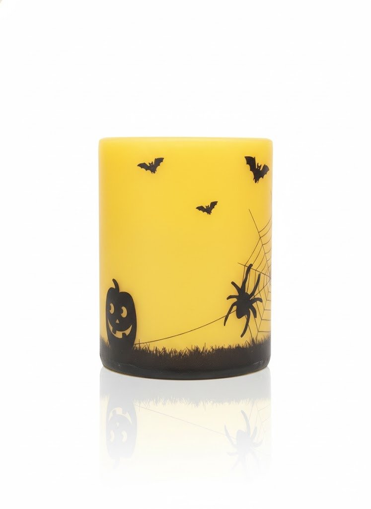 The candle’s surface is a cheerful, glowing yellow, contrasting sharply with the spooky black silhouettes. The design wraps around the candle, showcasing classic Halloween imagery: a grinning jack-o’-lantern, a large spider in its web, and a flock of shadowy bats flying overhead.