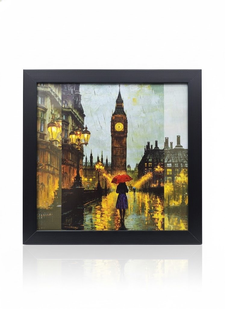 The artwork is securely encased in a sturdy black frame, ready to hang and instantly provide a sophisticated focal point in your living room, dining area, or office. This high-quality London rainy night wall art print makes an exceptional gift for travel lovers, fans of urban photography, or anyone seeking to add a moody, atmospheric, and highly artistic piece to their wall collection.