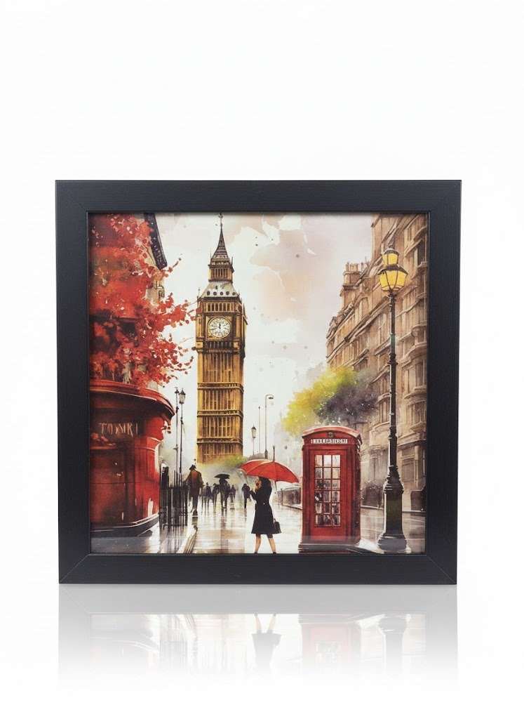 Celebrate the timeless elegance of the United Kingdom’s capital with this stunning framed London watercolor print. The artwork beautifully captures a quintessential street scene, dominated by the majestic Big Ben (Elizabeth Tower) and accented by the vibrant reds of a classic telephone box, a pillar box, and a figure holding an umbrella. The soft, artistic watercolor style gives the scene a nostalgic and cozy, rainy-day feel, perfect for creating a warm ambiance.