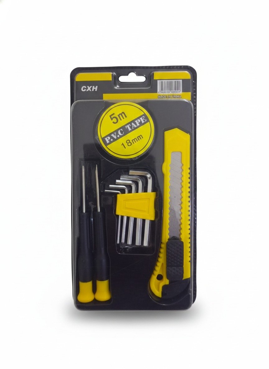 The Mini Hardware Tool Kit (8 Piece Set) is the perfect companion for every household and small project. This carefully curated set provides the fundamental tools needed for assembly, basic repairs, and crafts. The centerpiece is a durable, yellow-and-black utility knife with a comfortable grip and secure blade lock, ideal for cutting boxes, carpets, or excess material.