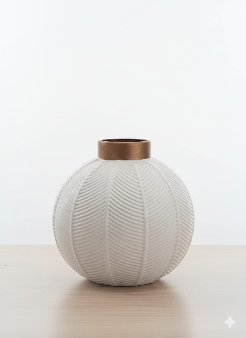 Elevate your interior design with this stunning Textured Ceramic Vase. Its unique spherical silhouette and intricate carved feather-like texture create a captivating focal point in any room. Finished in a soft, matte white or off-white hue, the vase is beautifully complemented by a striking metallic bronze-tone rim, adding a touch of contemporary luxury. Ideal for displaying dried botanicals, pampas grass, or standing alone as a piece of sculptural art on a mantelpiece, bookshelf, or side table. This textured ceramic vase seamlessly blends minimalist design with artisanal detail.