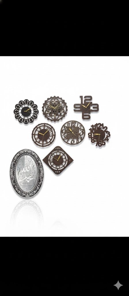Transform your living space with this comprehensive Decorative Wall Clock Set combined with a beautiful piece of Islamic Wall Art. This unique collection provides a cohesive, modern, and culturally rich look for any room. The set features multiple individual clock faces in varying sizes and abstract cut-out designs—including floral, gear-style, and geometric shapes—allowing for flexible arrangement as a striking gallery wall installation. Each clock features precision movement and stylish dark wooden or acrylic construction with metallic hands.