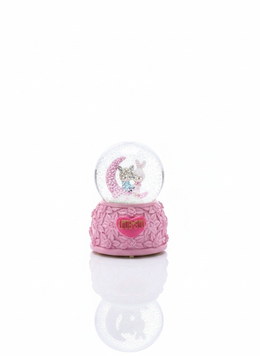 A charming, battery-operated pink snow globe featuring a glittery bunny figure sitting on a crescent moon, with an ornate base that plays music. Perfect as a romantic gift or decorative showpiece.