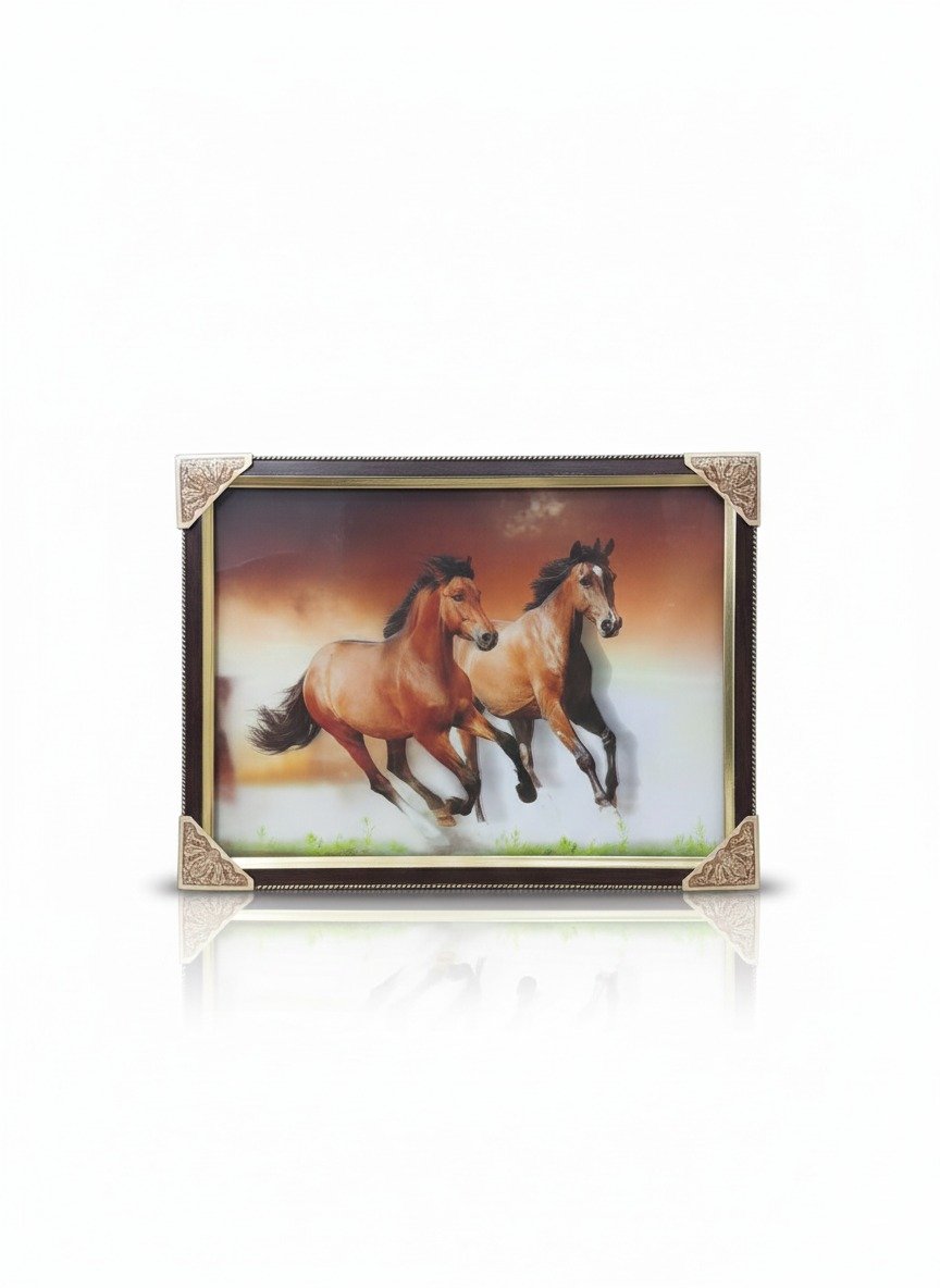 Framed in an elegant, classic design with ornate corner details, this piece is more than just decor; it’s a statement of strength and vitality. The imagery of running horses is universally associated with energy, perseverance, and passion.