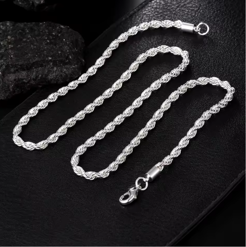 Discover the perfect blend of strength and style with our Sterling Silver Rope Chain Necklace. This jewelry piece features a meticulously intertwined rope design that reflects light from every angle, providing a luxurious shimmer. Whether you wear it alone as a statement piece or pair it with your favorite charm or pendant, its versatile design ensures it complements any outfit.
